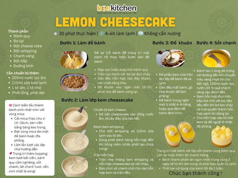 Bạn yêu thích vị chua dịu của chanh hòa quyện với lớp cheesecake mịn mượt béo ngậy? Với Set làm Lemon Cheesecake tại nhà từ BeeKitchen, việc tạo ra một chiếc bánh chanh thơm ngon, đẹp mắt chưa bao giờ dễ dàng đến thế – chỉ mất 30 phút chuẩn bị, không cần lò nướng!