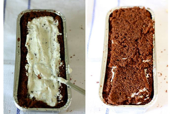 - Bước 7: Khi vỏ bánh đã nguội, nếu có khuôn loaf thì bạn có thể đo và cắt bánh thành những lát vừa với kích thước của đáy khuôn và 4 cạnh bên rồi dựng bánh xung quanh khuôn (nếu không có khuôn loaf bạn hoàn toàn có thể dùng một hộp nhựa hình chữ nhật để làm khuôn bánh), sau đó múc kem vào giữa, lấp đầy kem vào khoảng rỗng. Và kết thúc bằng việc đặt một lát bánh vừa với bề mặt của khuôn.
