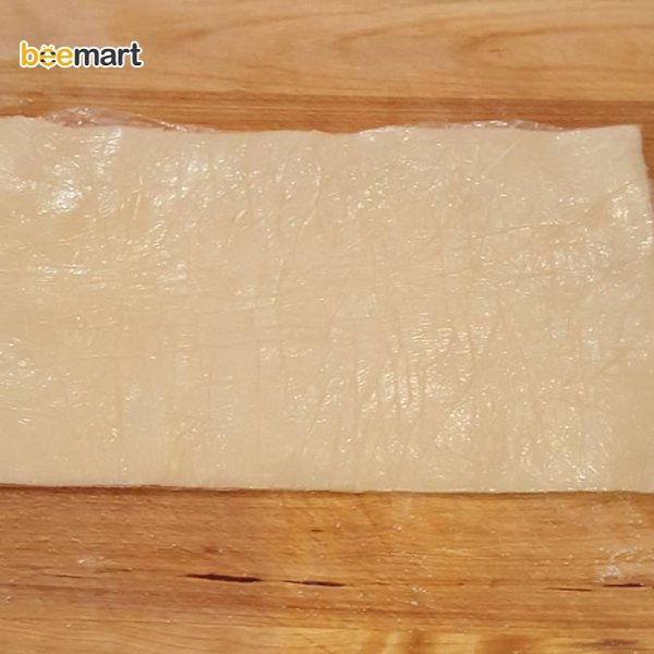 - Bước 2: Chia bột thành 8 phần bằng nhau, dùng màng bọc thực phẩm bao viên bột lại và cán thành hình chữ nhật như hình minh họa nhé! Cho bột vào tủ lạnh trong 10 phút để bơ không bị chảy.