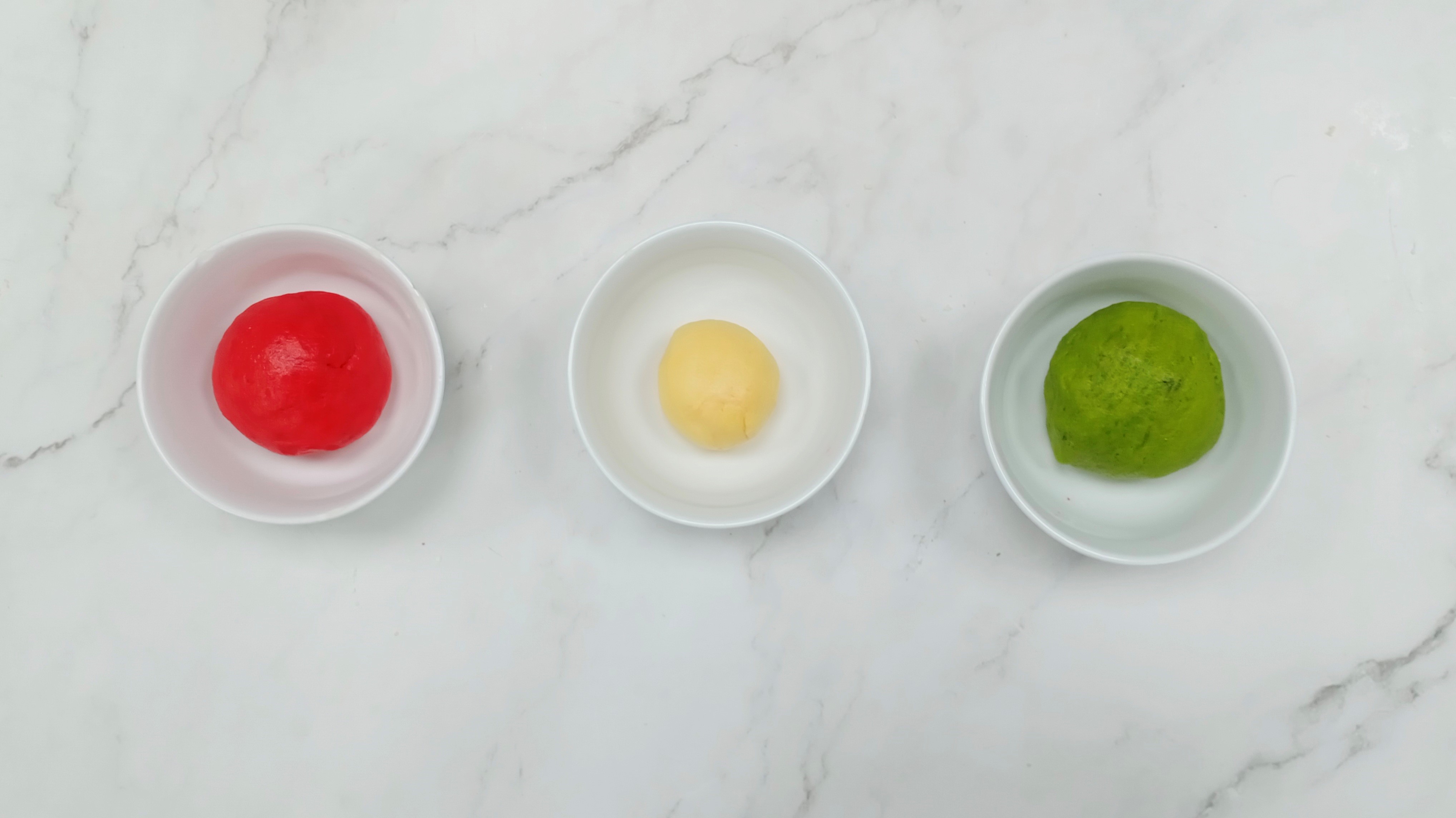 Chia bột thành 3 phần như hình. Phần nhiều nhất, bạn cho màu thực phẩm màu đỏ, 2 phần còn lại, 1 phần bạn cho màu xanh và 1 phần cho màu vàng vào, trộn đều cho màu và bột hòa lẫn vào nhau.