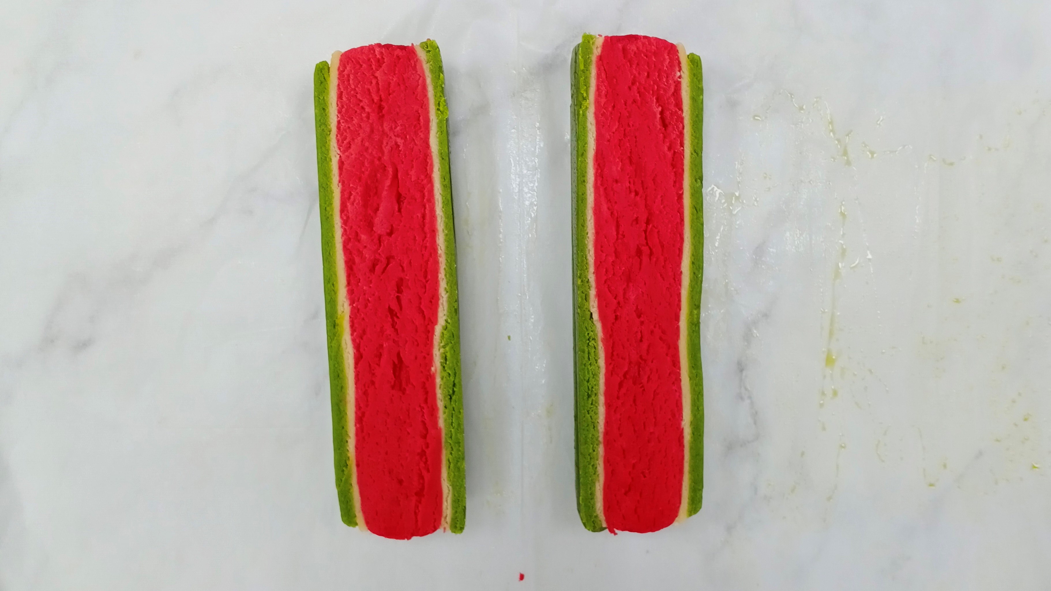 - Bọc lần lượt từng lớp vỏ dưa. Bọc lớp bột trắng ngoài lớp bột màu đỏ sao cho phủ kín được hết lớp bột đỏ. Tiếp tục dùng lớp bột xanh bọc ngoài lớp trụ bột màu trắng đã bọc lớp bột đỏ sao cho phủ kín hết lớp bột