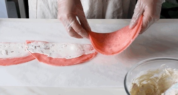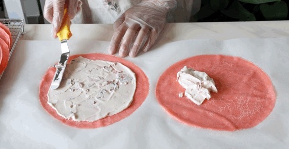 Phết kem bước 4 vào giữa vỏ bánh, không cần phết ra xung quanh, sau đó gập đôi lại, lặp lại thao tác này