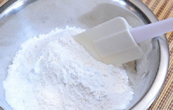 + Cho 70 gr bột mì và 100 gr bột ngô vào bát to. Tiếp đó từ từ cho 125 ml sữa tươi không đường vào bột. Trộn đều tay để bột không bị vón cục.