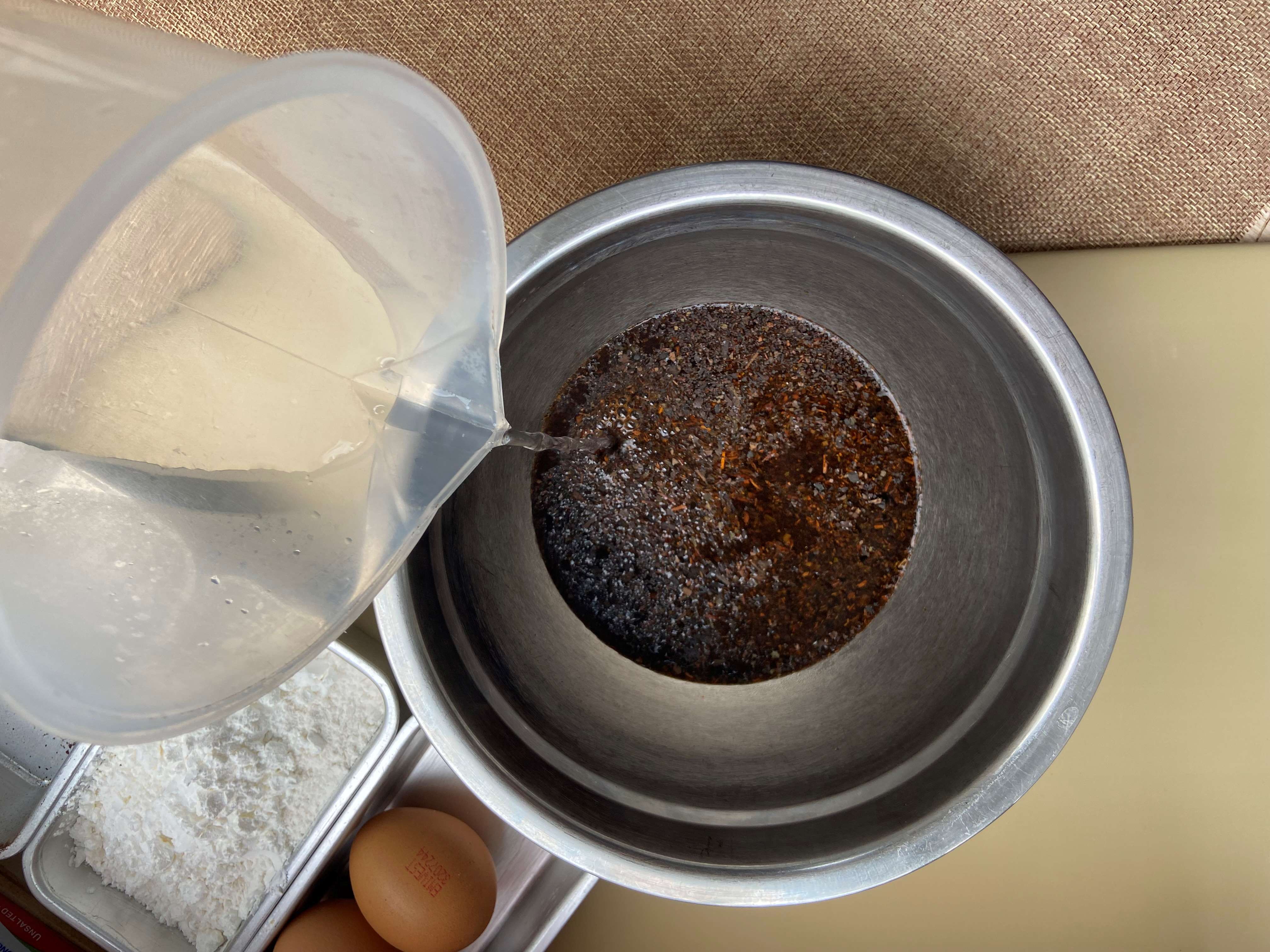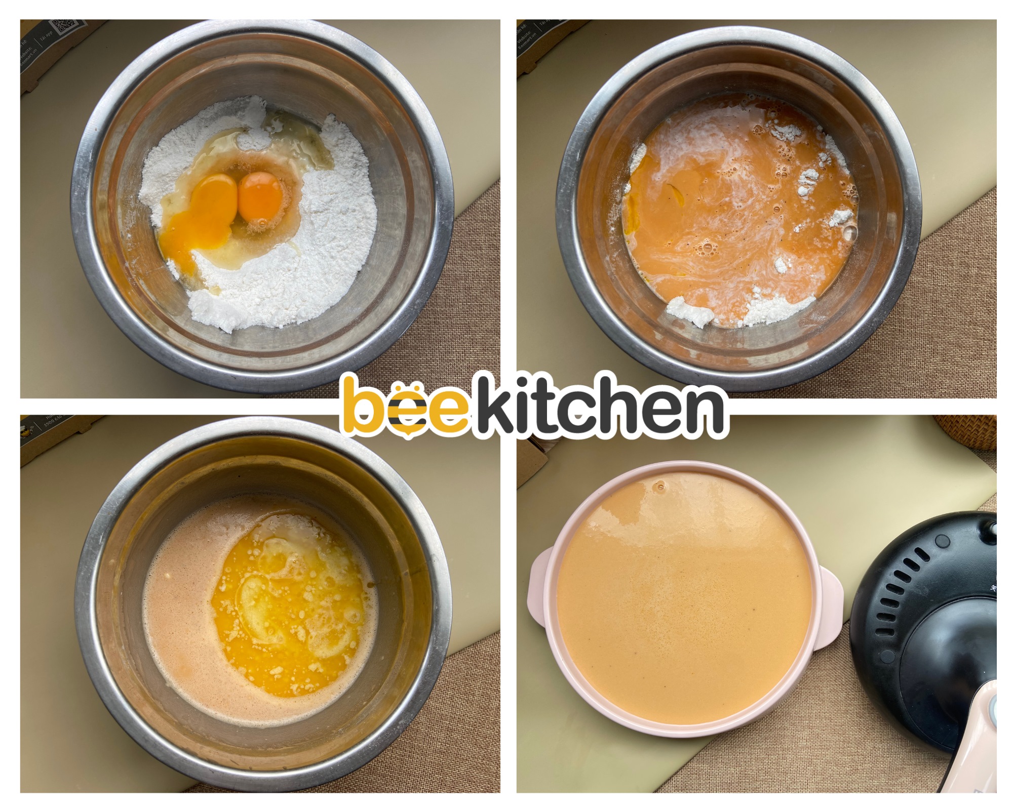 - Cho tiếp lần lượt các hỗn hợp chất lỏng bao gồm: 2 quả trứng, 100ml nước cốt trà thái đỏ, 110ml sữa tươi, 40g bơ lạt đun chảy vào hỗn hợp bột trên rồi quấy đều.