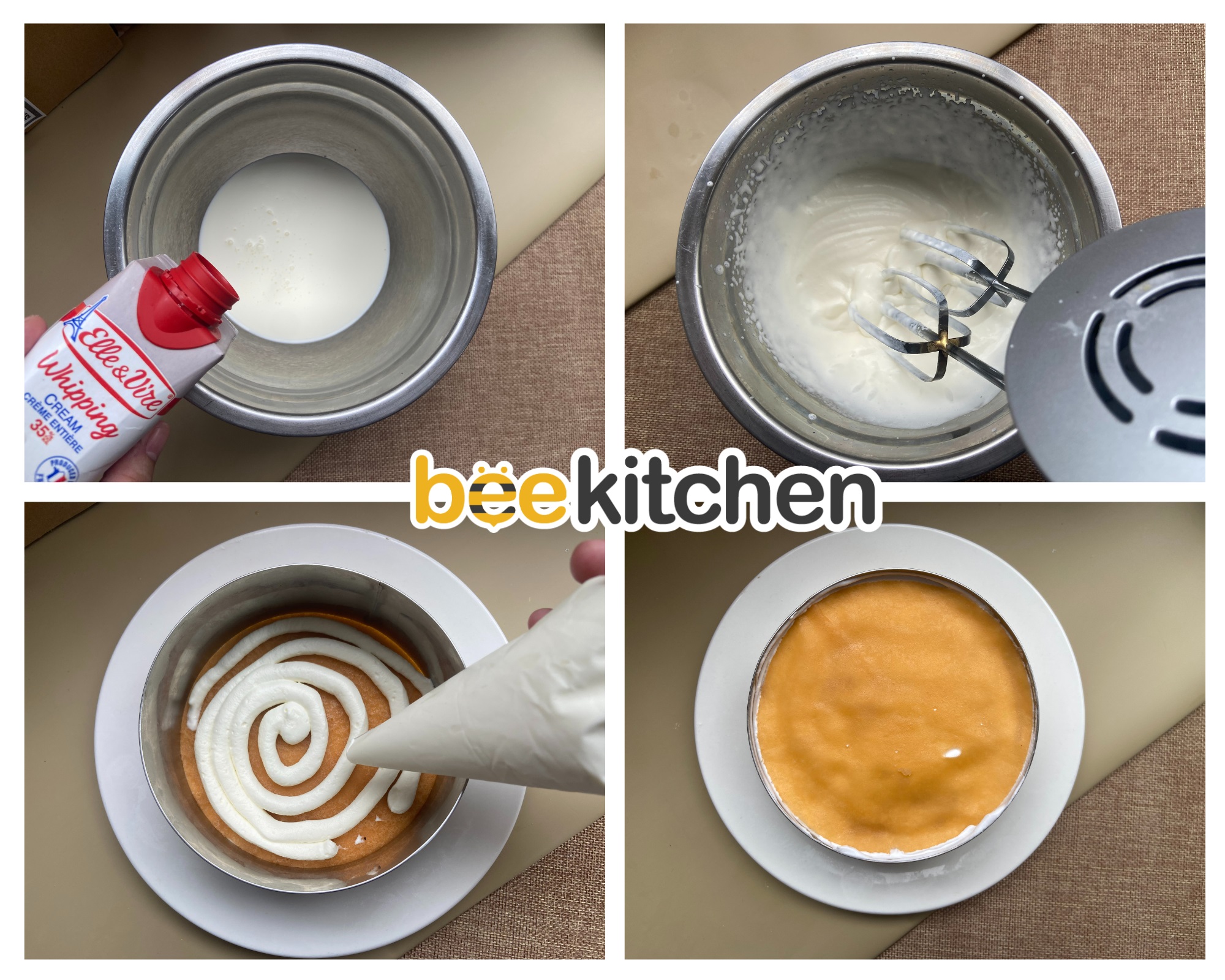 - Đánh bông 150ml kem tươi với 20g đường đến khi kem bông cứng (thấy vân nổi lên trên mặt kem, nhấc que đánh trứng lên thấy kem tạo thành chóp)