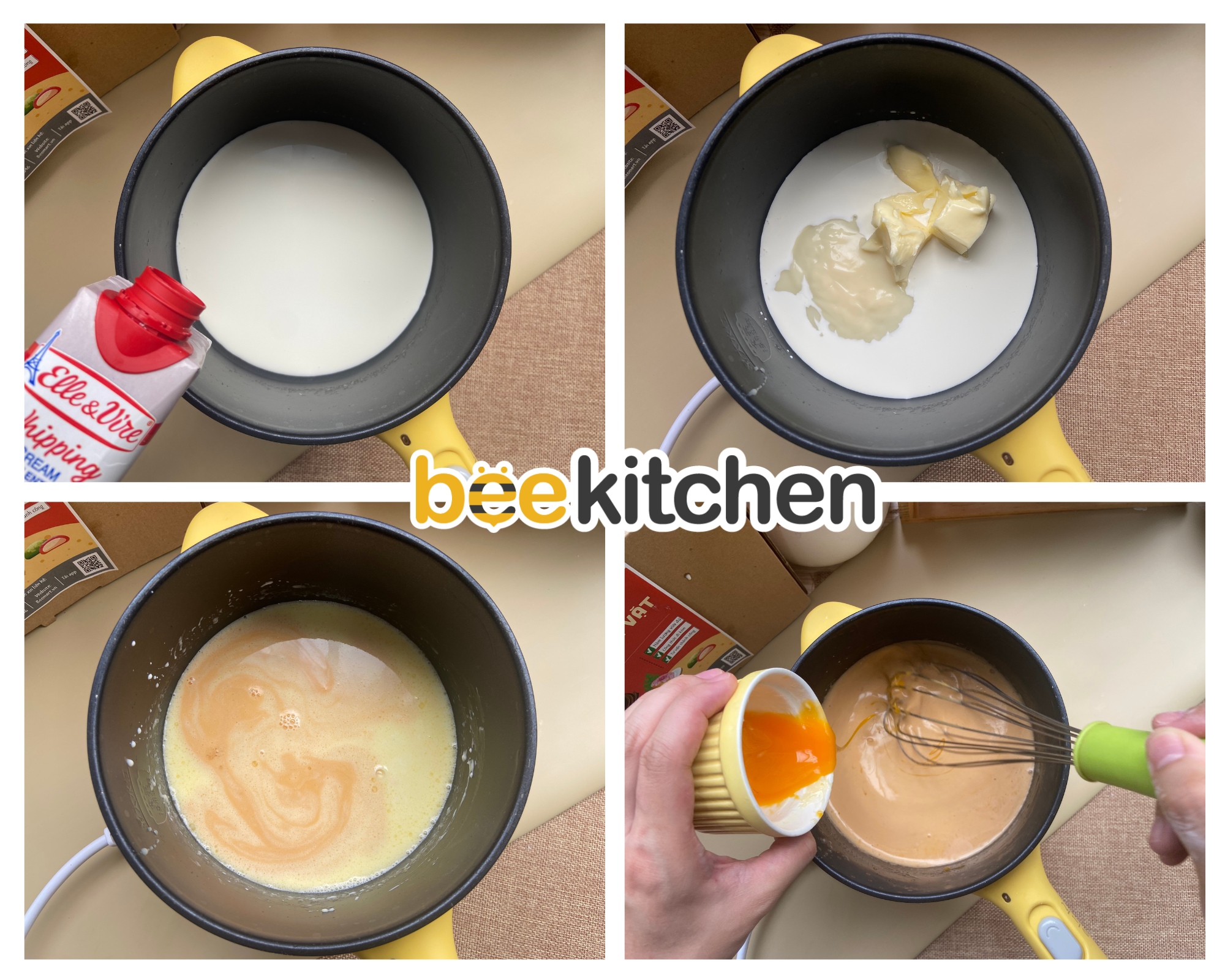 - Đổ 50ml whipping + 40g bơ + 40g sữa đặc + 2 lòng đỏ trứng + 70ml nước cốt trà thái + 3g bột bắp vào nồi nhỏ quấy đều.