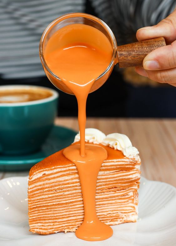 Phần đặc biệt nhất của chiếc bánh crepe này là phần sốt kem trà thái đi kèm nên đừng quên khi ăn bánh bạn nhé.