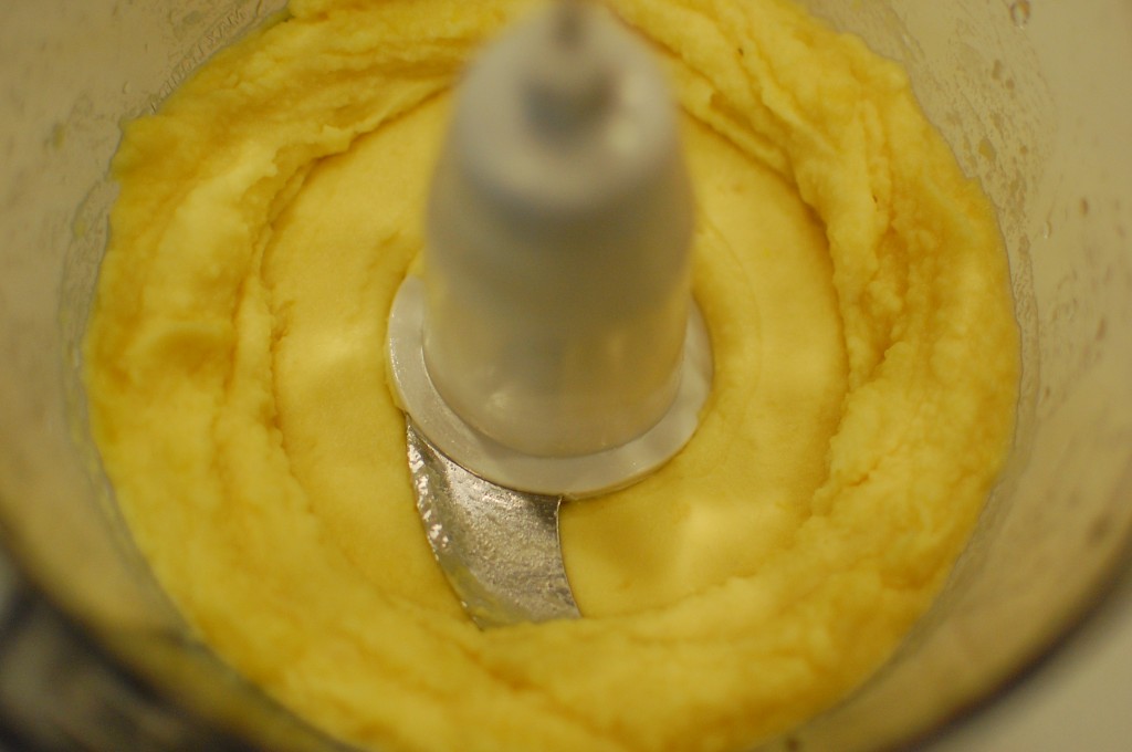 - Bước 3: Bơ nhạt để mềm ở nhiệt độ phòng rồi đun chảy, bỏ vào hỗn hợp đậu xanh cùng whipping cream, từ từ rây bột mì và bột bắp vào rồi xay mịn tiếp.