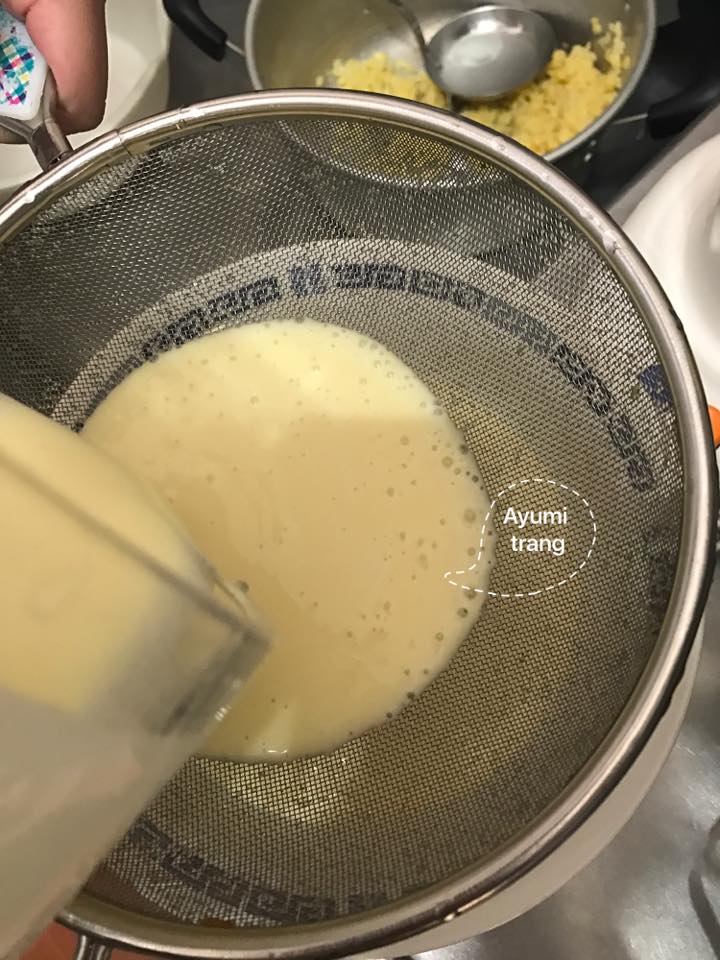 - Bước 4: Sau khi xay mịn, lọc hỗn hợp đậu xanh qua rây cho thật sánh mịn. Áo khuôn chống dính bằng một lớp dầu dừa rồi đổ hỗn hợp bánh vào để đem nướng.