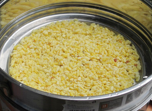 - Bước 1: Đậu xanh rửa sạch, ngâm qua đêm, đem hấp chín 30 phút hoặc nấu đậu với nước xâm xấp mặt đến khi chín mềm.