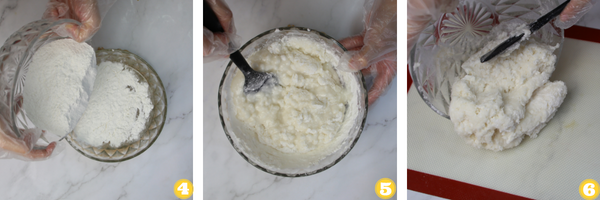 - Đổ bột bánh dẻo vào trong tô, dùng thìa hoặc dĩa khuấy đều, nhanh tay cho bột hòa cùng với hỗn hợp lỏng, thành một hỗn hợp hơi sền sệt thì dừng lại. Ngay sau đó đổ khối bột ra mặt phẳng để bắt đầu nhồi bột.