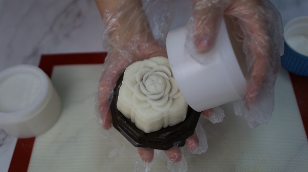 - Cho mặt đẹp của viên bột quay xuống đáy khuôn, dùng lực của hai lòng bàn tay ấn bột xuống (lực ấn càng mạnh thì bánh càng nét), để bánh trong khuôn nghỉ khoảng 1 phút rồi lấy bánh ra khỏi khuôn.