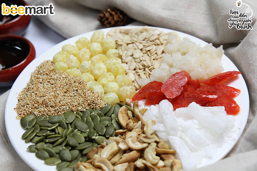 Tham khảo ngay set nguyên liệu làm nhân thập cẩm nhà Bee đã chia sẵn theo hàm lượng, giúp bạn làm được khoảng 8-10 nhân bánh trung thu (loại bánh 150g).