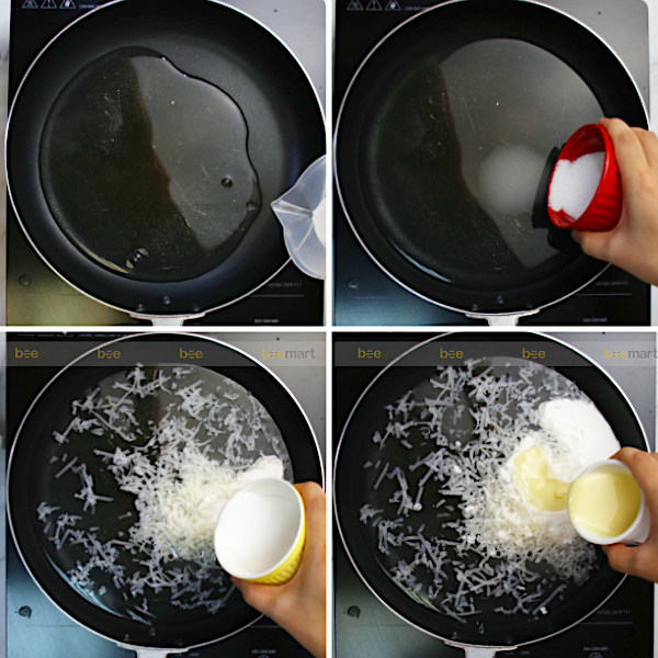Trước tiên, bạn thêm 200g nước lọc, 40g đường, 30g dừa nạo sợi, 50g nước cốt dừa, 80g sữa đặc và 100g cốm khô vào chảo.
