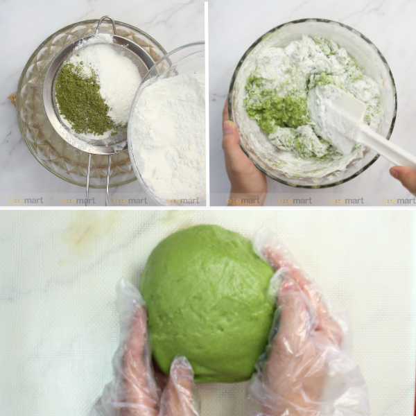 Rây 230g bột nếp chín và 5g bột trà xanh vào tô, khuấy đều đến khi không còn thấy bột khô là được bạn nhé! Sau đó, đổ bột ra bàn, nhồi sơ bột đến khi được 1 khối bột mềm dẻo, không vón cục (bạn không cần nhồi quá lâu).