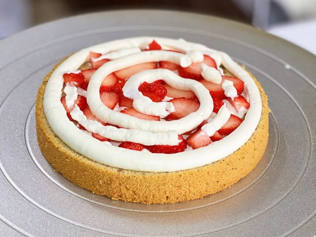 - Lấy 1 lớp cốt bánh , bơm kem tươi xung quanh bánh