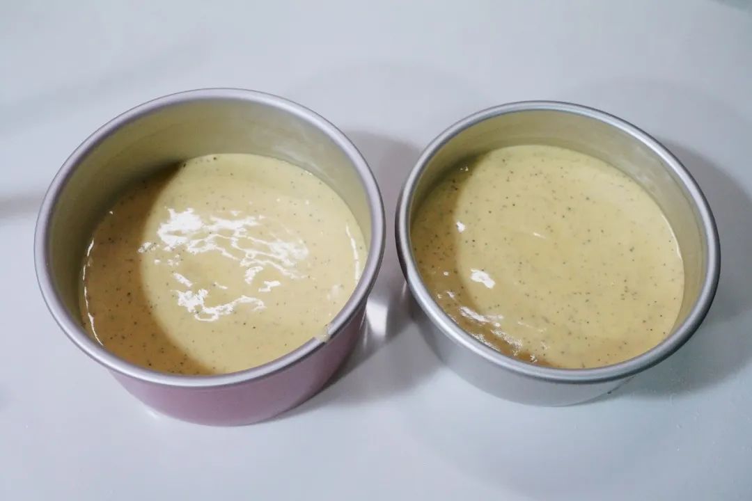 Chia bột làm 2 phần đổ vào 2 khuôn bánh 16 cm, lắc khuôn vài lần cho hết bọt khí
