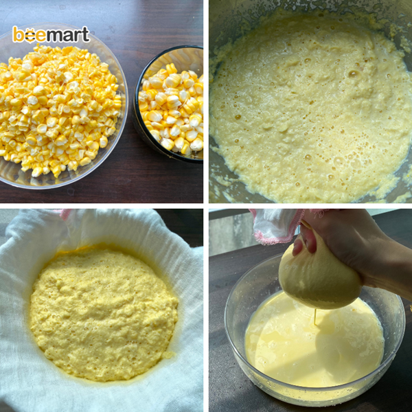 - Tách hạt bắp rời sau đó chia làm 2 phần, 1 phần khoảng 50g nguyên hạt để riêng, phần còn lại thêm 110ml sữa và xay nhuyễn mịn hoàn toàn. Sau khi xay xong dùng vải xô để lọc lấy phần sữa bắp.
