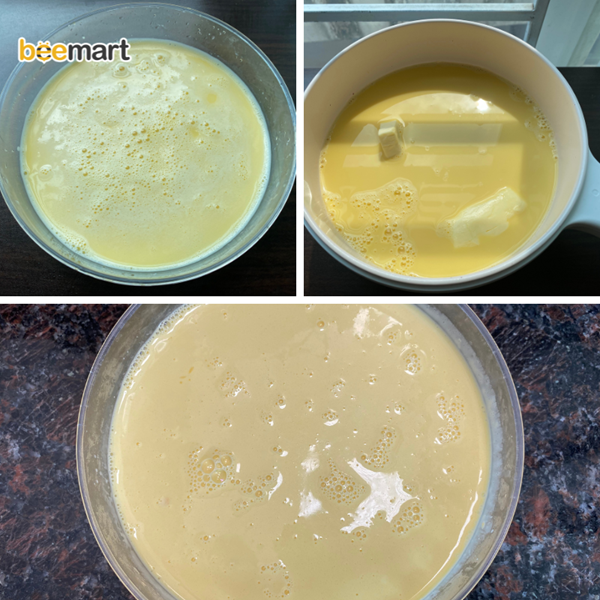 - Thêm dần hỗn hợp lòng đỏ vào tô lòng trứng đã đánh bông, trộn đều đến khi hòa quyện.