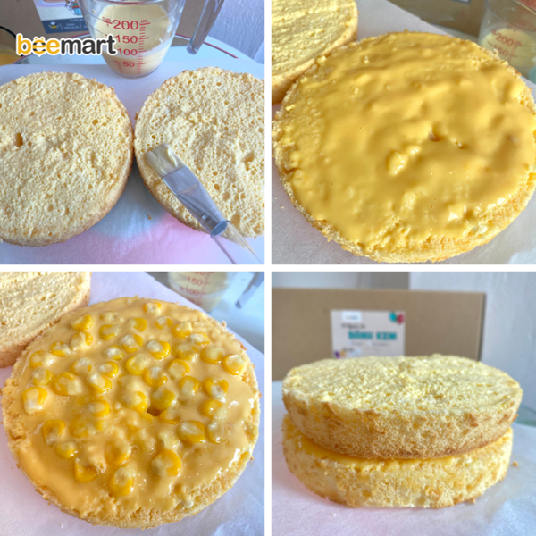 + Kem trứng bắp sử dụng làm nhân bánh. Hãy phết lên bạt bánh một lớp vừa đủ giữa các tầng bạn nhé.