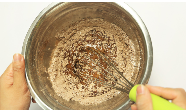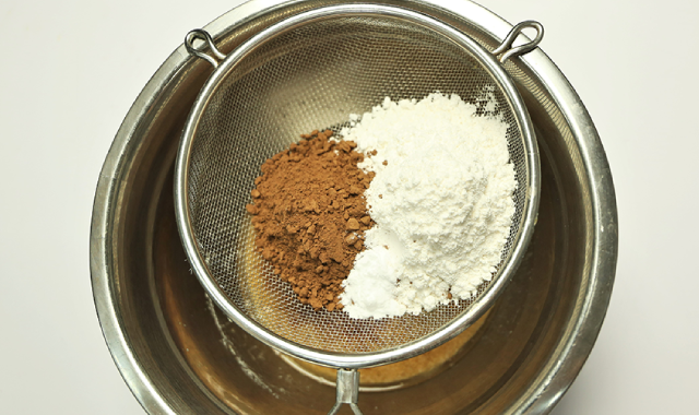 - Rây hỗn hợp gồm: 62g bột mì, 21g bột cacao, 2g baking soda và 2g muối vào âu trứng sữa ở bước 2.