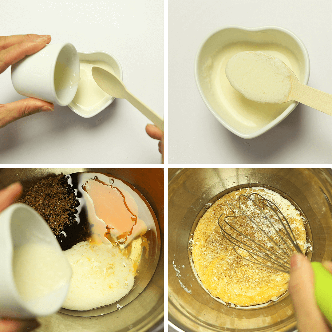 - Trộn hỗn hợp trứng sữa: Cho butter milk ở bước trên cùng 60g dầu dừa, 1 quả trứng và 50g đường đen vào một âu trộn bột dùng phới lồng trộn đều tới khi hòa quyện.