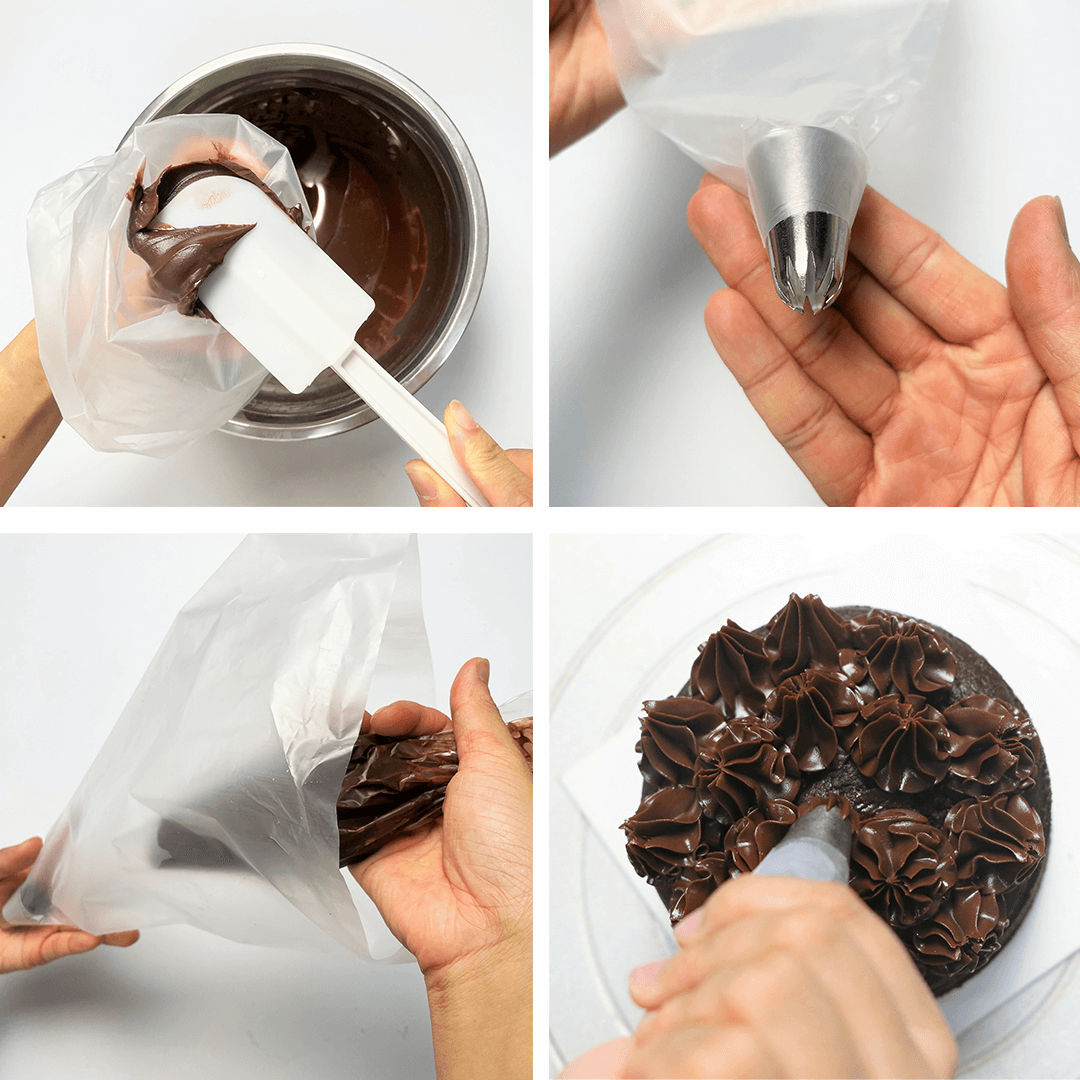 - Lồng túi có kem socola vào trong túi có cắt đầu phun kem và bắt đầu bắt kem lên bánh