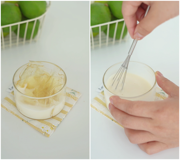 Đun nóng sữa, cho lá gelatin đã ngâm vào khuấy đều