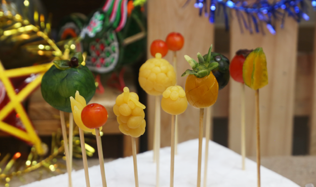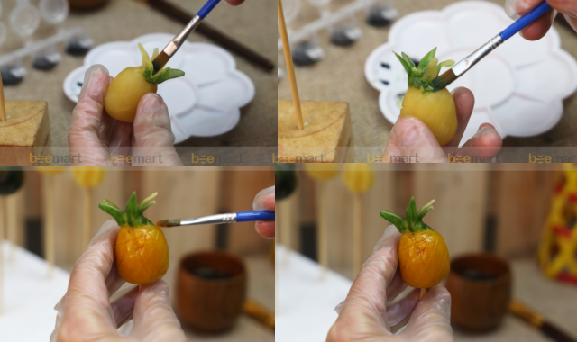 - Cuối cùng dùng cây xiên cắm vào các loại quả vừa tạo hình