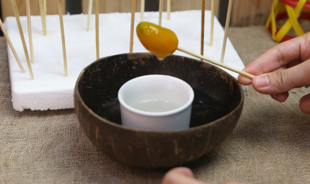 - Lần lượt nhúng các loại quả vào phần thạch vừa nấu và để nguội là có thể thưởng thức