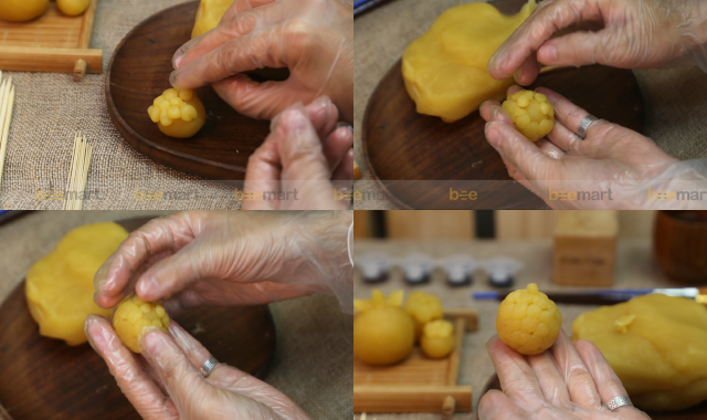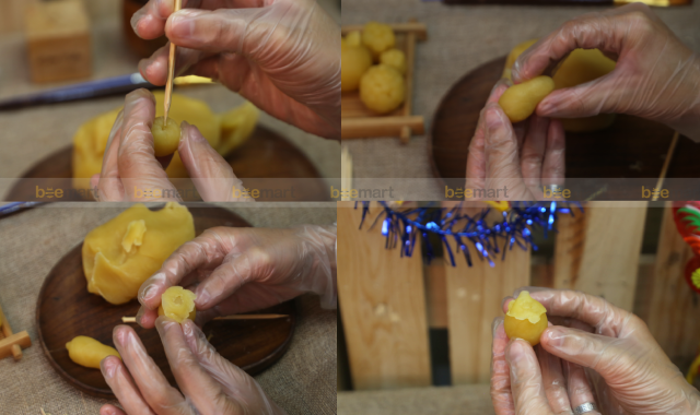 - Lấy 1 phần nhân đậu xanh khoảng 50g, vo tròn lại như hình quả bưởi