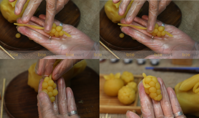 - Nặn nhân đậu xanh thành 1 dây dài và nhỏ để làm cuống nho