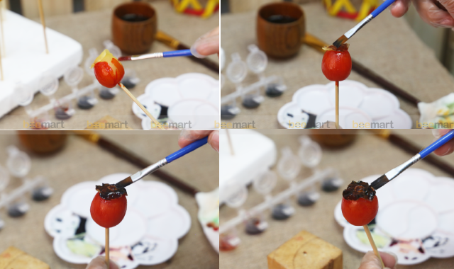 - Lấy thêm một phần nhân đậu xanh nhỏ, vo tròn và nhấn dẹt cho mỏng rồi đặt lên trên quả hồng để làm cuống