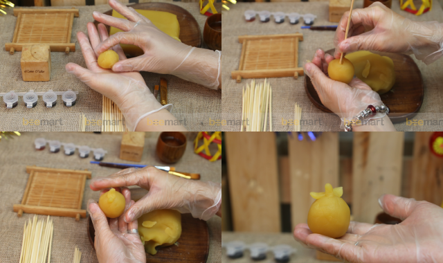 - Nặn thêm khoảng 4-5 hình tròn nhỏ bằng đầu đũa rồi gắn lên quả măng cụt để làm hoa thị. Có thể tạo thêm những quả măng cụt to nhỏ khác nhau tùy theo ý thích