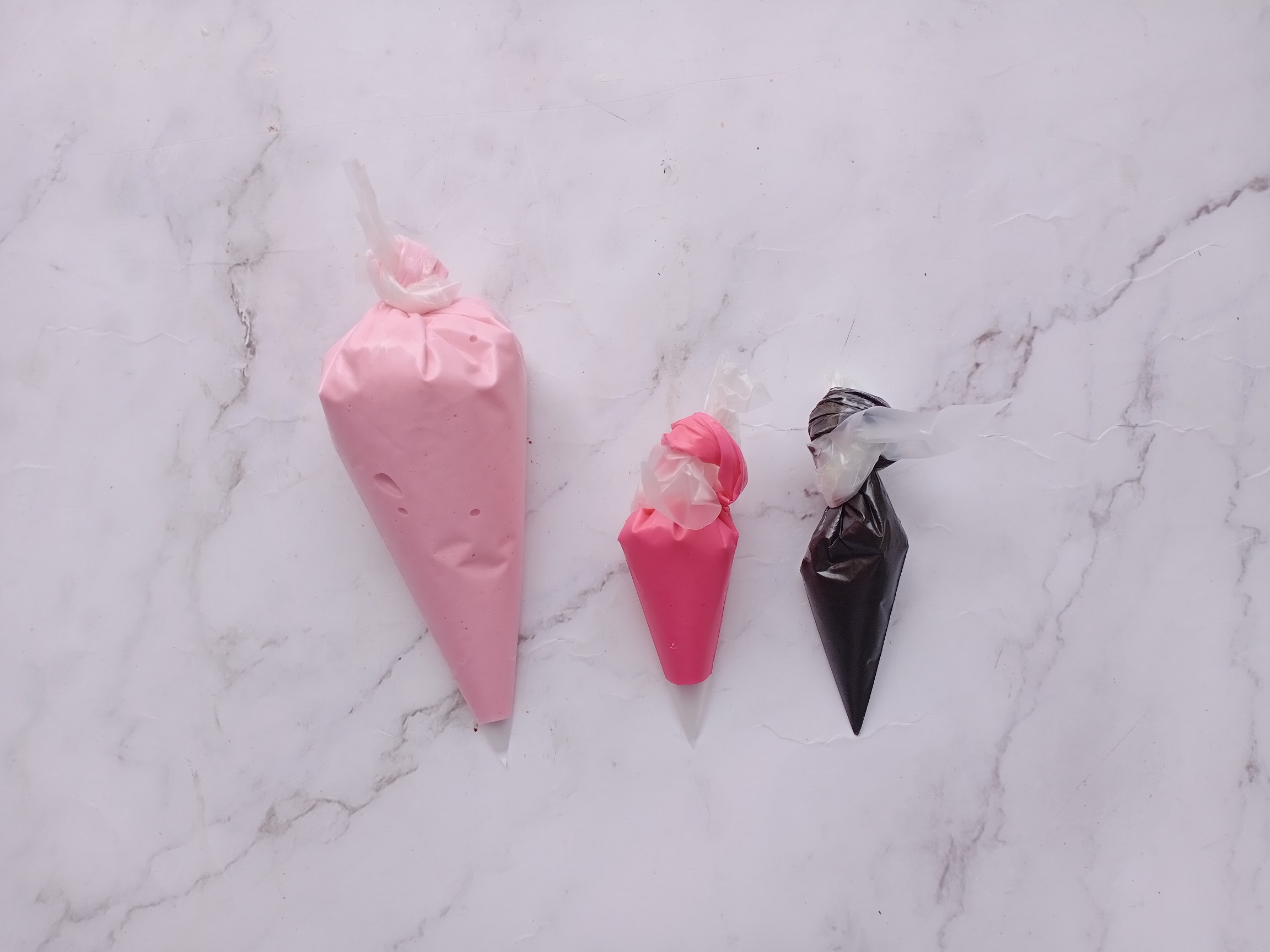 Cho 3 phần bột màu vào 3 túi bắt kem khác nhau, buộc chặt để chuẩn bị tạo hình bánh.