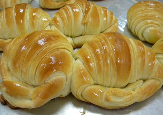 - Bước 5: Khi cuộn đáy tam giác to cắt làm đôi cạnh đáy dài, khi se cua sẽ tạo hình càng cua được dài và đẹp nhé, nếu bạn thích bánh mì cua có nhân thì có thể bỏ 1 miếng phô mai con bò cười vào trước khi cuộn.