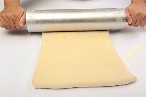 - Bước 3: Sau 10 phút, cán viên bột thành hình chữ nhật, càng cán bánh mì cua sẽ càng đẹp.