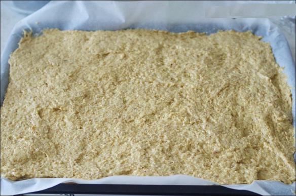 Trong lúc này tranh thủ trải giấy lên khay nướng. Khi đủ 5 phút thì trải bột đều lên khay.