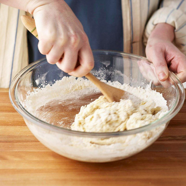 Các bạn cho bột mì, đường và muối vào một cái âu, sau đó trộn đều lên. Tiếp đó cho phần mem nở vào âu và tiếp tục trộn đều. Khi hỗn hợp khô đã được trộn đều thì các bạn tạo một lỗ ở giữa âu bột rồi cho sữa tươi, trứng, bơ nhạt đun chảy vào. Dùng spatula trộn đều phần chất lỏng này với phần bột để quyện vào nhau thành một khối.