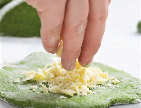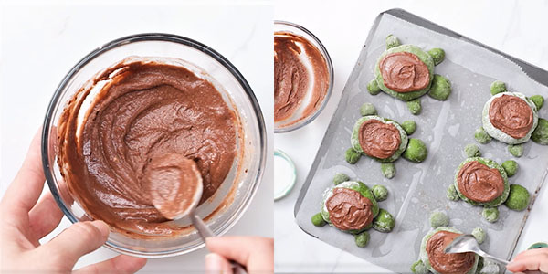 - Bước 4: Lấy miếng bột làm thân rùa ra, ép mỏng rồi cho 15g socola vào giữa làm nhân, gói lại cho kín. Lật úp xuống để mặt bột mịn ở bên trên. Làm tương tự với 5 miếng bột còn lại