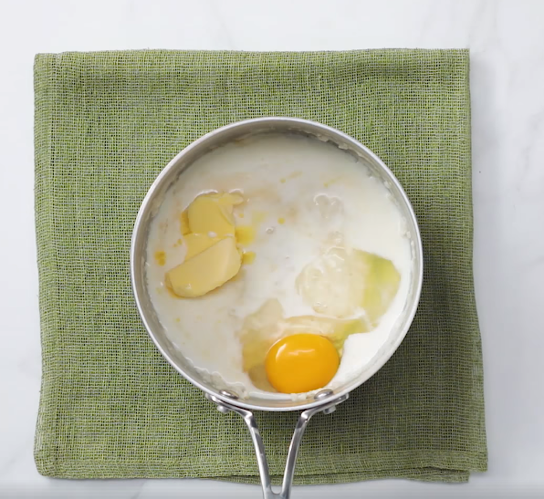 - Bước 1: Trộn bột mì, nước và sữa vào nồi, dùng phới lồng khuấy cho tan. Đun nóng hỗn hợp trên lửa vừa, khuấy liên tục trong khoảng 3 - 5 phút, hỗn hợp sẽ cô đặc lại. Tắt bếp rồi để nguội bớt.