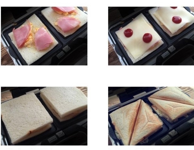Bước 3: Bắt đầu cho các nguyên liệu lên mặt các lát bánh đầu tiên với 3 hương vị khác nhau nhé! Phết mứt, rắc socola hoặc xếp xúc xích đan xen phô mai. Sau đó cho vào khuôn, đậy lát bánh mì còn lại vào và đóng nắp máy, khóa chốt.