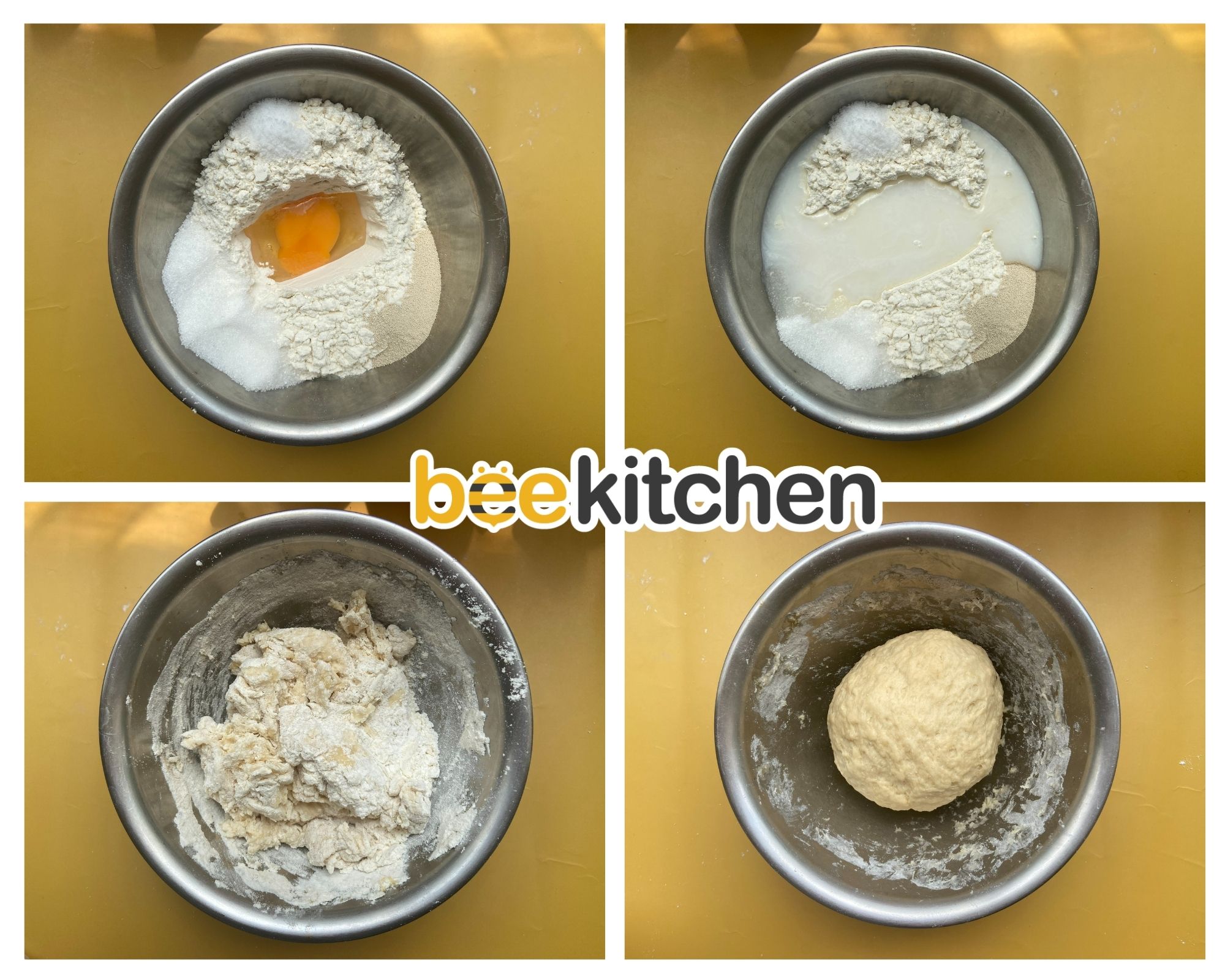 - Trộn đều 280g bột mì + 30g đường + 3g muối + 5g men nở vào 1 cái tô lớn.