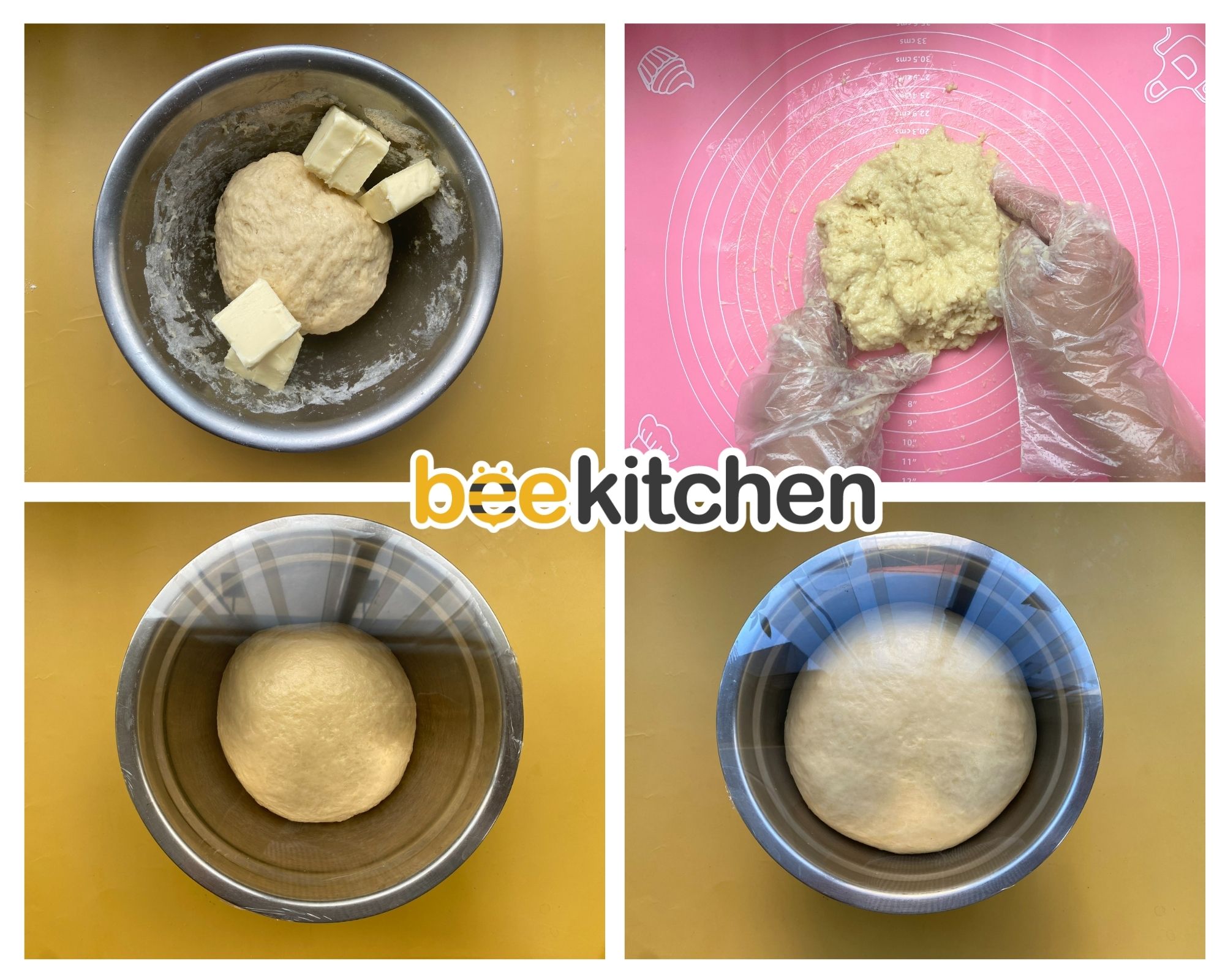 - Cắt 80g bơ thành các miếng vuông nhỏ (lưu ý để lạnh), đem bơ vào nhồi cùng bột.