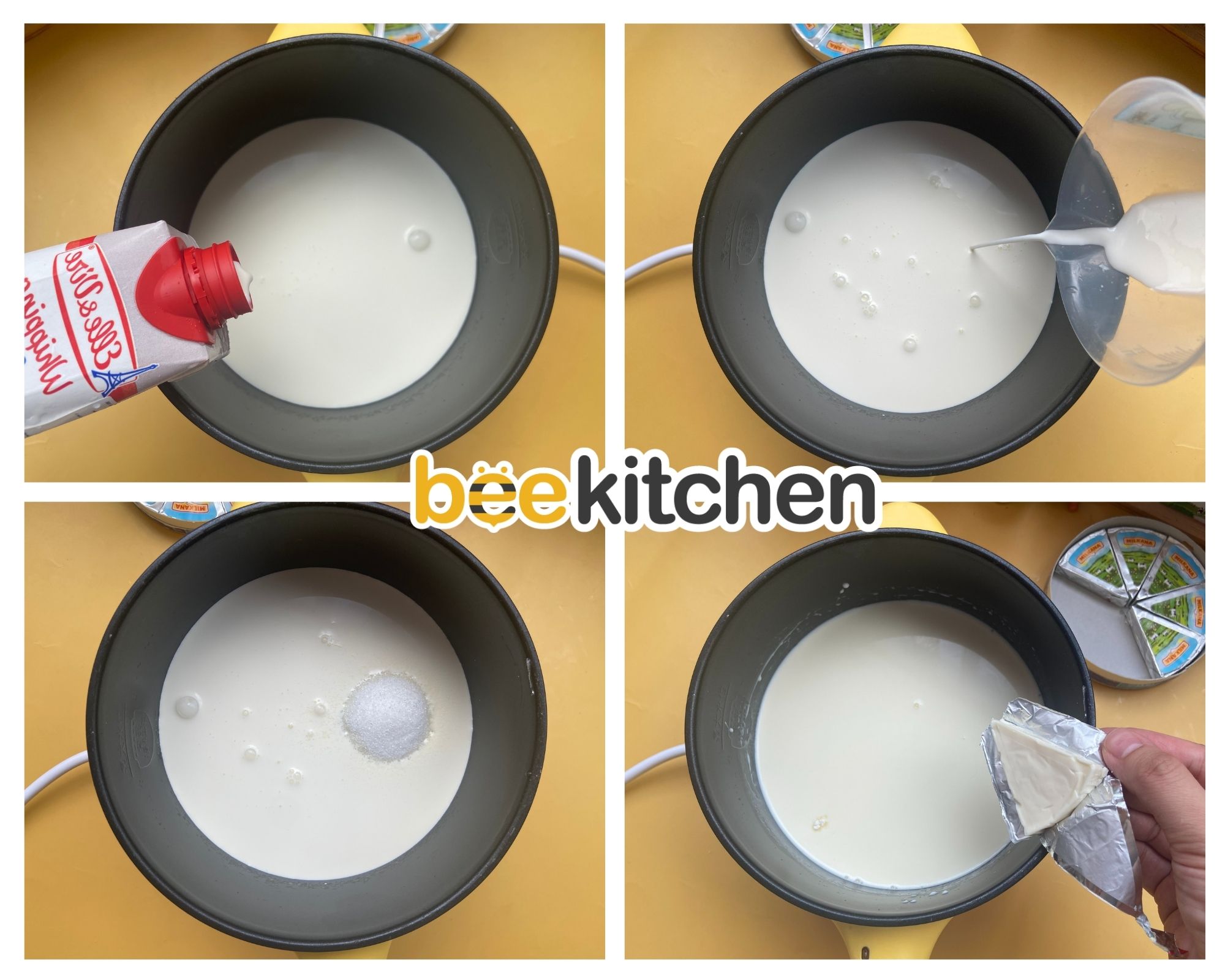 Cho 200ml whipping cream + 70ml sữa tươi + 3 miếng phomai vào nồi đun ấm. Trong quá trình đun nghiền mịn phomai cho tan và hoà quyện thành hỗn hợp sánh mịn thì tắt bếp.