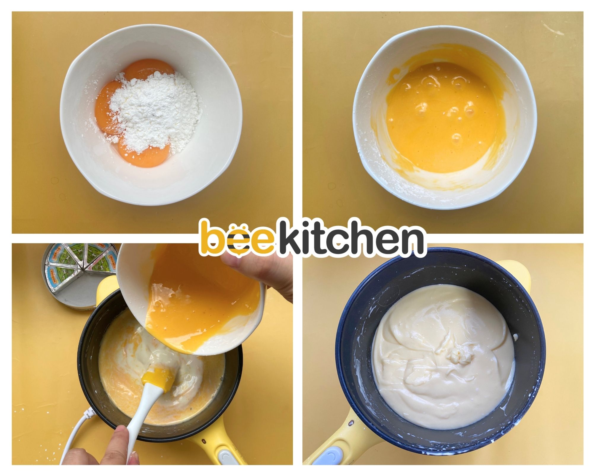 Đổ hỗn hợp trứng vừa đánh vào hỗn hợp sữa bên trên và khuấy đều. Sau đó bật bếp ở lửa nhỏ và khuấy đều hỗn hợp tới khi sánh lại thì tắt bếp, để nguội rồi cho vào túi bắt kem đi kèm.