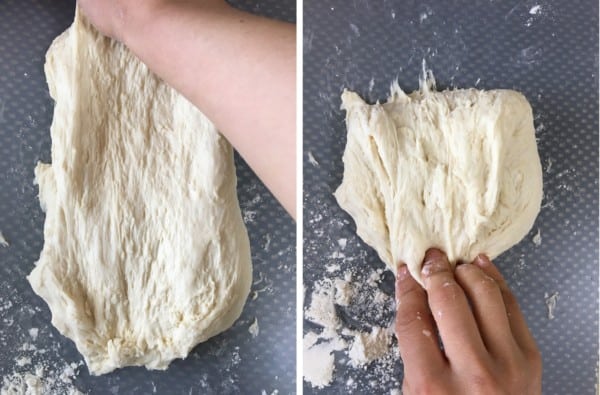 Cách nhào bột: 1 tay giữ, 1 tay cầm bột kéo ra xa, gập bột lại, xoay cục bột 90 độ và lặp lại từ đầu. Khi bột đã bắt đầu róc, không dính bàn không dính tay thì có thể cầm cục bột đập mạnh xuống bàn vài lần và lại lặp lại quá trình.