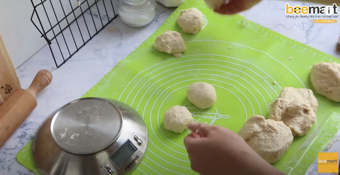 - Bột sau khi ủ, tiếp tục lấy bột ra nhồi sơ lại bột và chia thành 50g/ viên