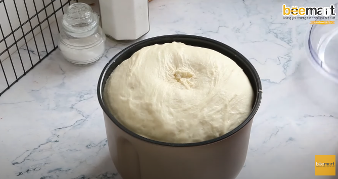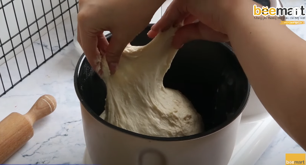 Nhồi máy: Đổ 1000g bột + 60g đường + 40g bơ+ 10g men + 10g muối vào máy trộn bột. Bật máy và thêm từ từ 600g nước vào trộn đều, để máy nhồi trong khoảng 20 phút đến khi tạo màng