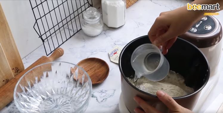 Cho tất cả các nguyên liệu vào máy nhồi bột, nhồi nguyên liệu trong vòng 20 phút đến khi bột mịn màng, có thể kéo màng thì dừng lại.